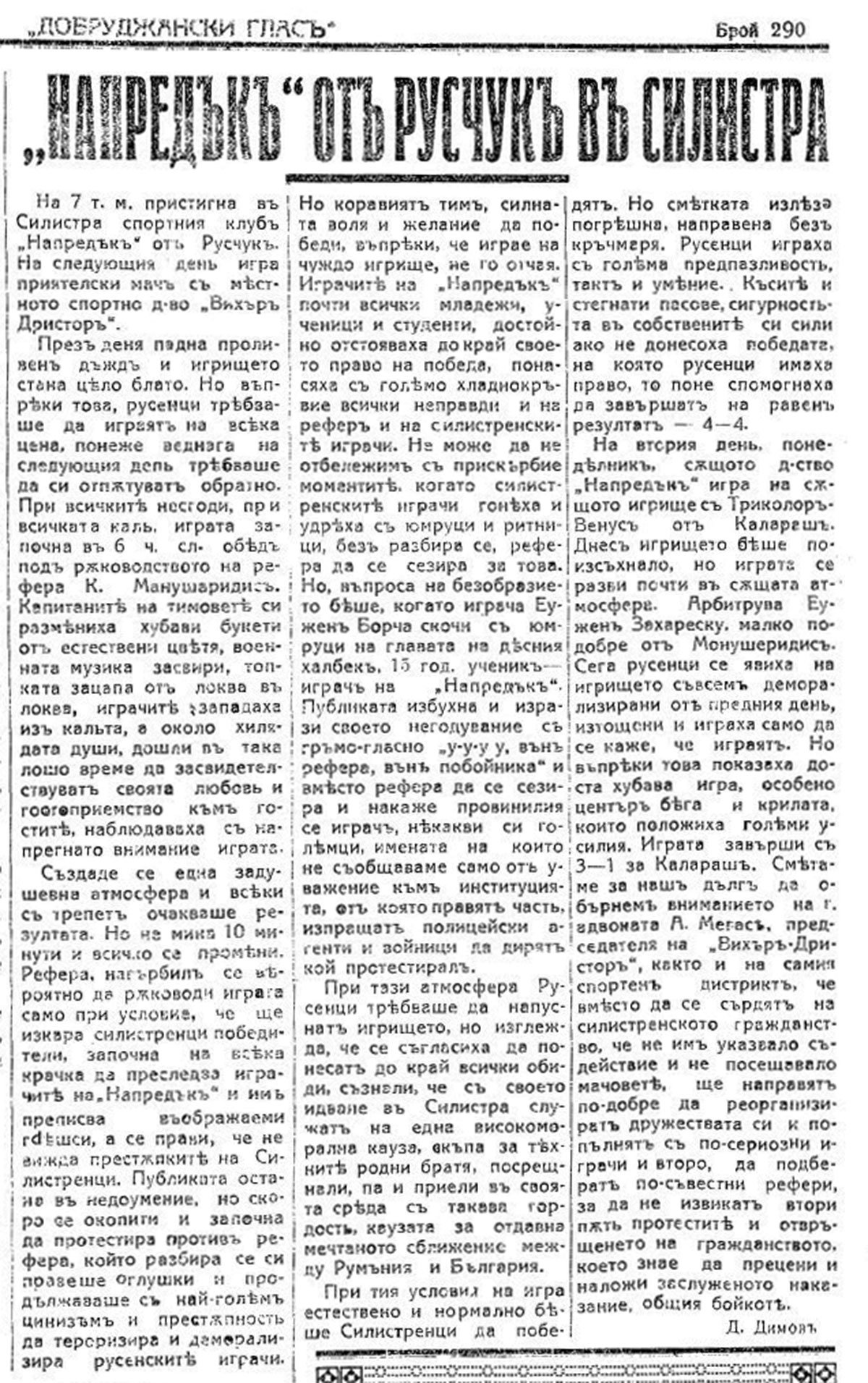 Благодарение на обширна статия в излизащия в Базарджик (дн. Добрич) вестник „Добруджански глас“ научаваме подробности по гостуването на „Напредък“ в Силистра през лятото на 1937 г. Според автора на мателирала Д. Димов мачът преминава при скандално съдийство и тежки условия на игра вследствие на падалия обилен дъжд. Двубоят на 8 август между „Вихър“ /“Вифор-Дристор“/ и „Напредък“ завършва 4:4.
