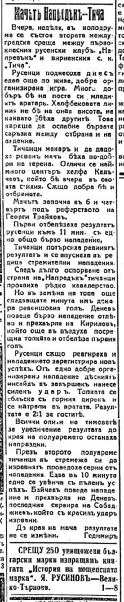 Тича (Варна) – Напредък (Русе) 2 август 193612 септември 2022"Спортно Русе" 2 август 1936 2 - 2 Краен резултат . Начален час Първенство/турнир Сезон 0:00 Приятелска среща 1935/36 Инфо Споделете в: Click to share on Facebook (Opens in new window) Facebook Click to share on X (Opens in new window) X Click to share on WhatsApp (Opens in new window) WhatsApp Click to share on Telegram (Opens in new window) Telegram Click to email a link to a friend (Opens in new window) Email Click to print (Opens in new window) Print