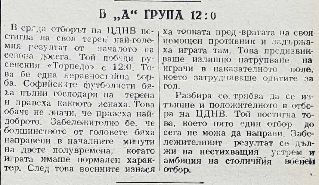 ЦДНВ (София) – ДСО Торпедо (Русе) 18 юли 19513 юни 2025"Спортно Русе" 18 юли 1951 12 - 0 Краен резултат . Начален час Първенство/турнир Сезон Кръг 0:00 „А“ Републиканска футболна група 1951 XVII кръг Инфо Споделете в: Click to share on Facebook (Opens in new window) Facebook Click to share on X (Opens in new window) X Click to share on WhatsApp (Opens in new window) WhatsApp Click to share on Telegram (Opens in new window) Telegram Click to email a link to a friend (Opens in new window) Email Click to print (Opens in new window) Print