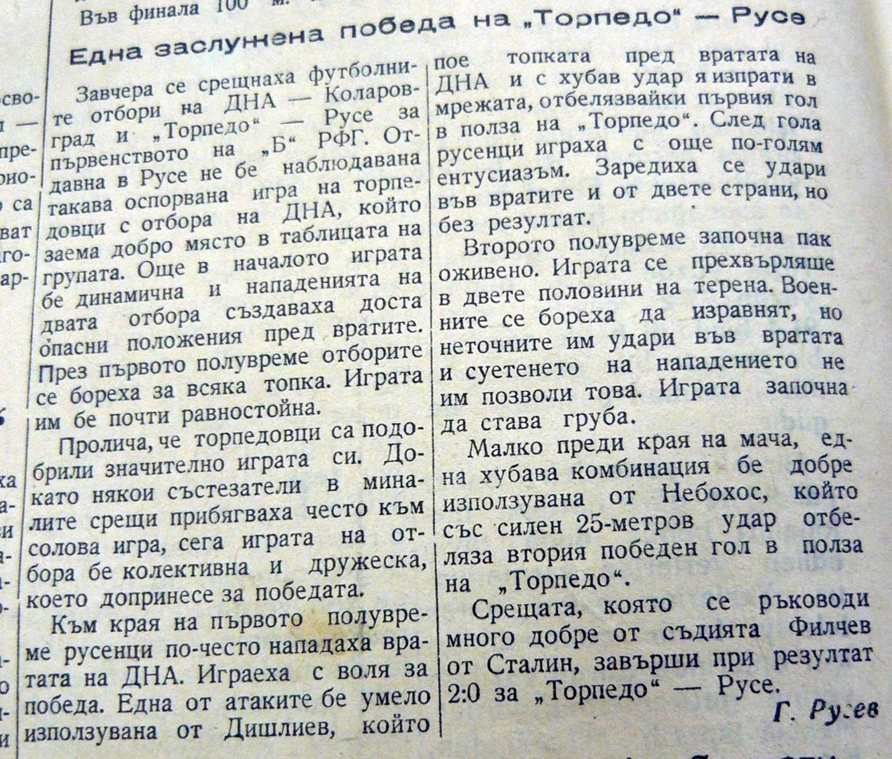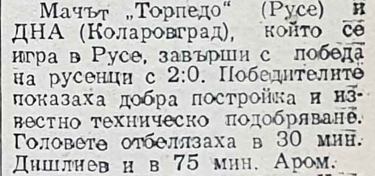 Срещата завършва 2:0 за Торпедо. По-късно полученият резултат е анулиран и е присъден служебен резултат 3:0 за ДНА заради нередовен състезател в отбора на Торпедо.